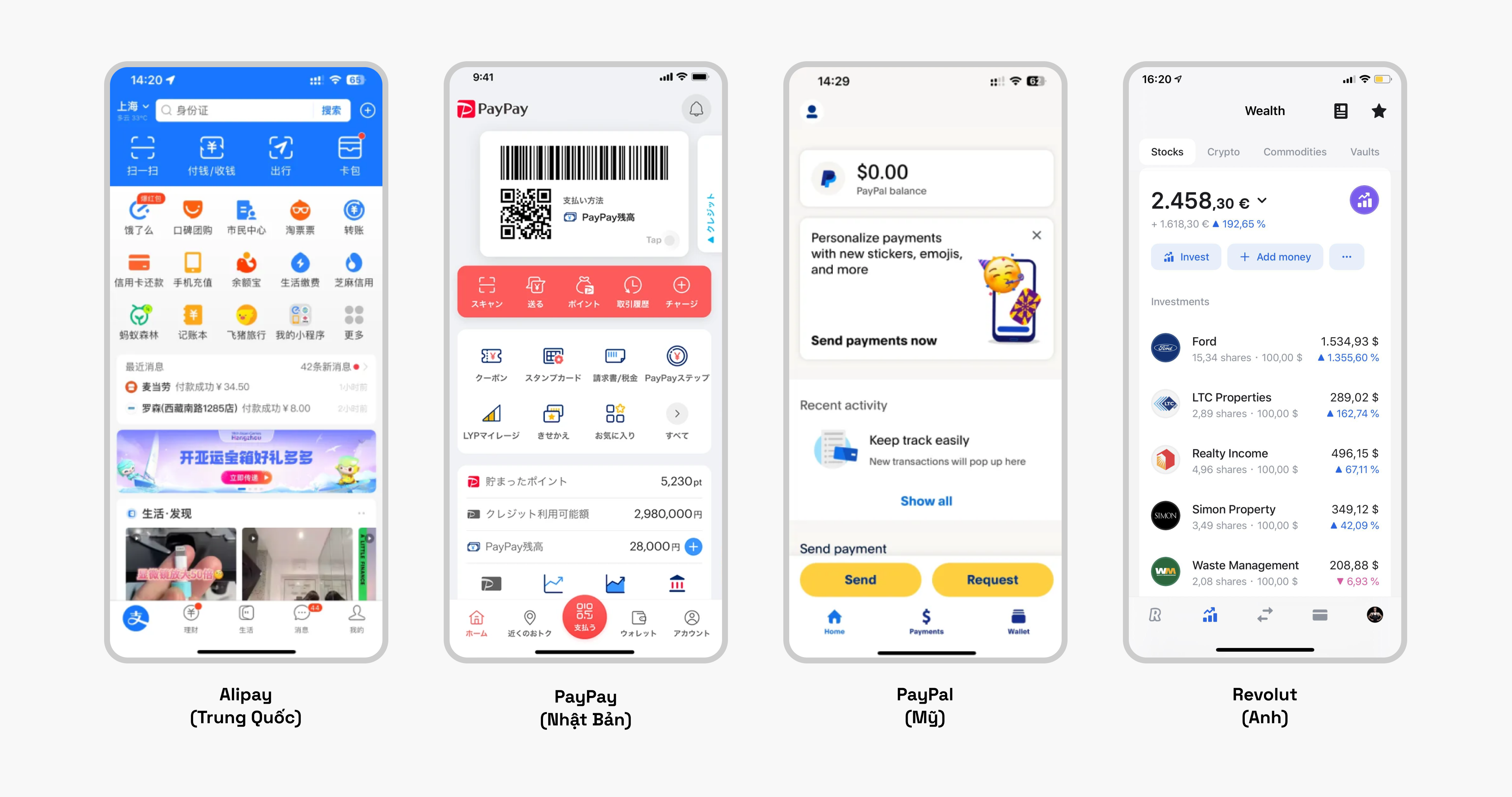 Alipay hay Wechat đều là những super-app cực kỳ nổi tiếng và có lượng người dùng cực kỳ lớn. Cùng nền văn hoá giao tiếp với Alipay là PayPay của Nhật Bản, và cùng với PayPal là Revolut của Anh.
