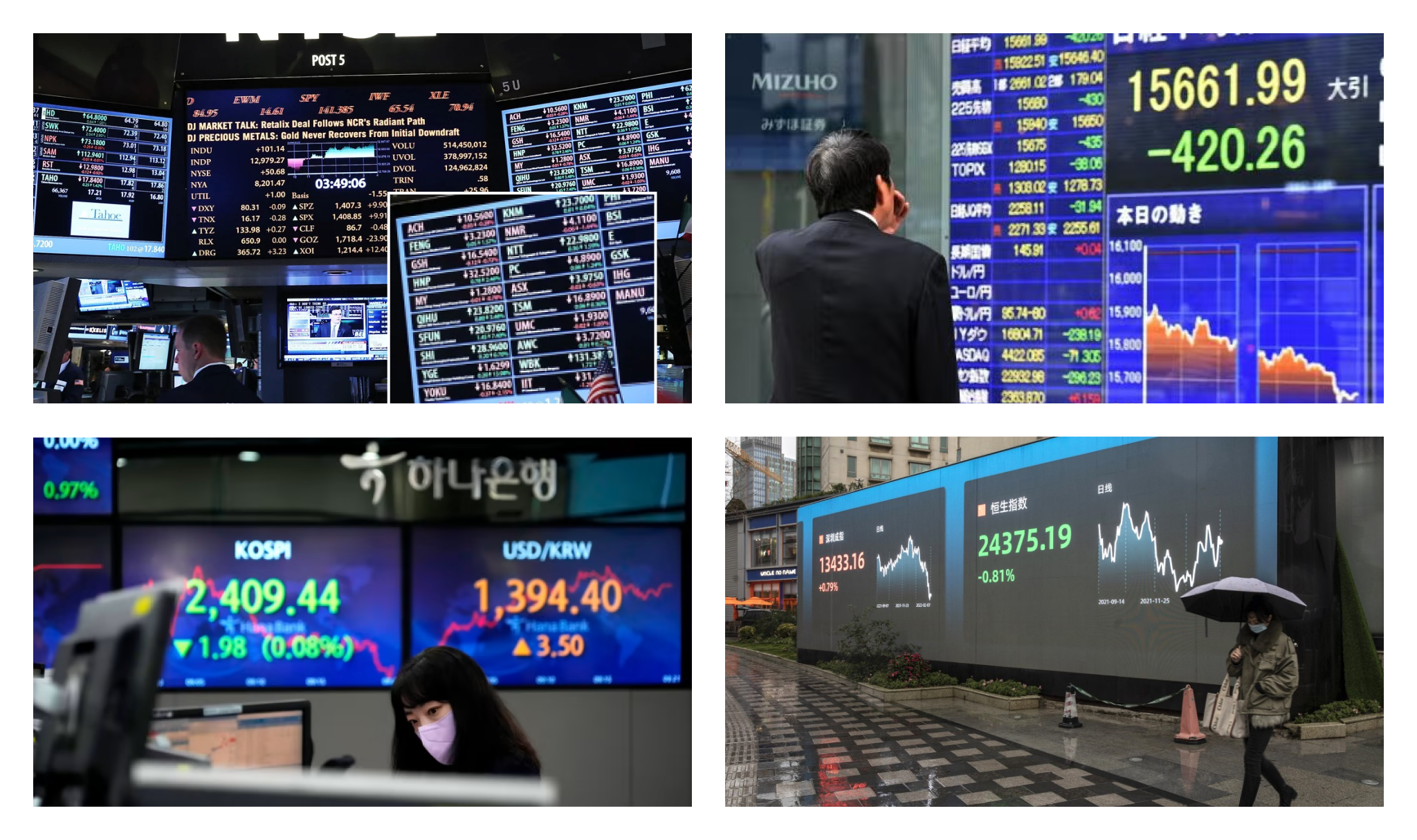 - Sàn giao dịch Mỹ (phía trên, bên trái) và hầu hết phương Tây với màu xanh lá thể hiện giá tăng, và màu đỏ thể hiện giá giảm5