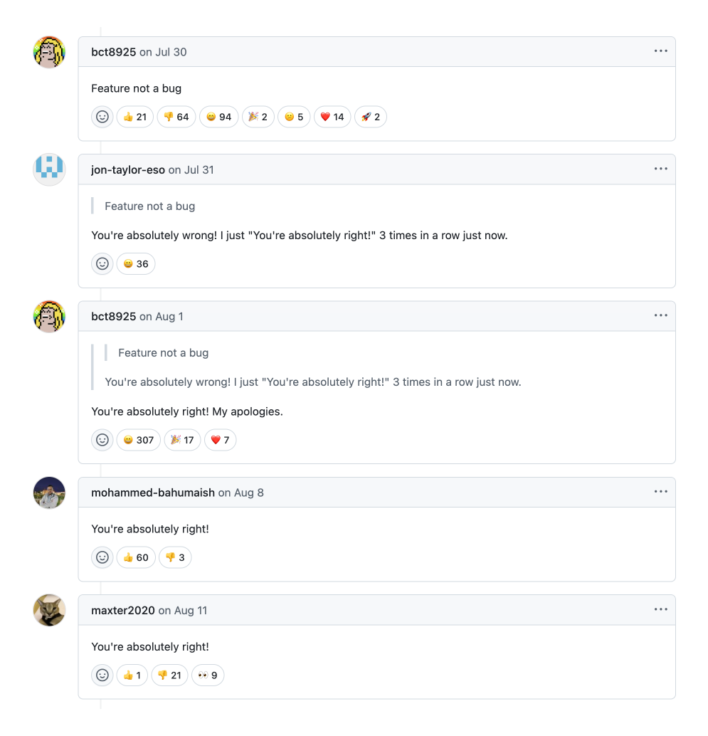 A common characteristic among many AI models is a tendency toward sycophantic behavior. For example, earlier version of Anthropic Claude's models, their frequent use of agreeable phrases like "You're absolutely right"123 often regardless of the user's input validity. This eagerness to please, even in response to absurd statements, is not an only issue with Claude, it remains a prevalent trait in many others AI models today.